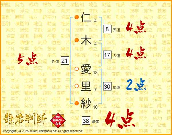 仁(4画)木(4画) 愛(13画)里(7画)紗(10画)
