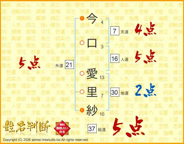 今(4画)口(3画) 愛(13画)里(7画)紗(10画)
