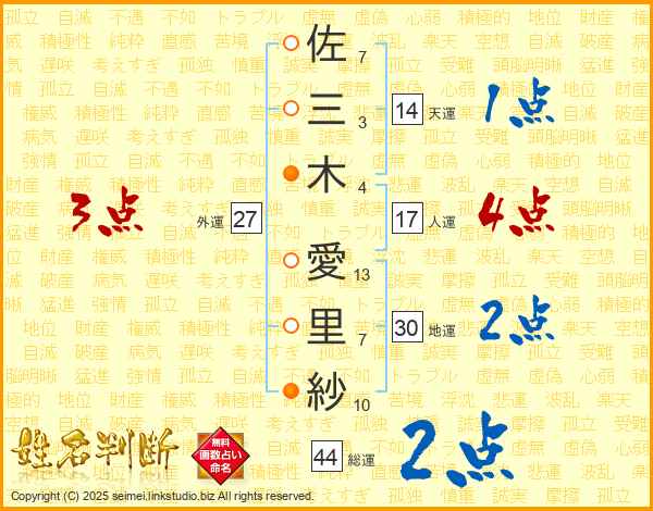 佐(7画)三(3画)木(4画) 愛(13画)里(7画)紗(10画)