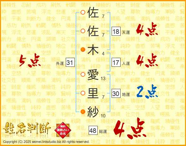 佐(7画)佐(7画)木(4画) 愛(13画)里(7画)紗(10画)