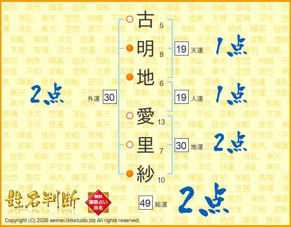 古(5画)明(8画)地(6画) 愛(13画)里(7画)紗(10画)
