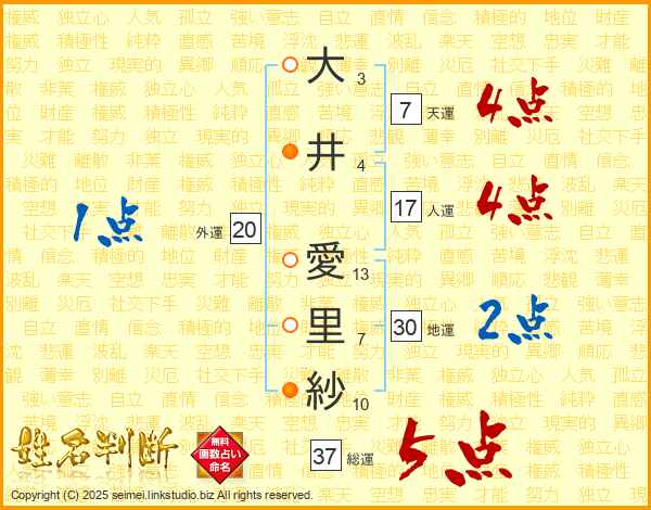 大(3画)井(4画) 愛(13画)里(7画)紗(10画)