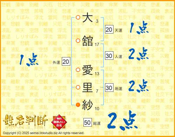 大(3画)舘(17画) 愛(13画)里(7画)紗(10画)