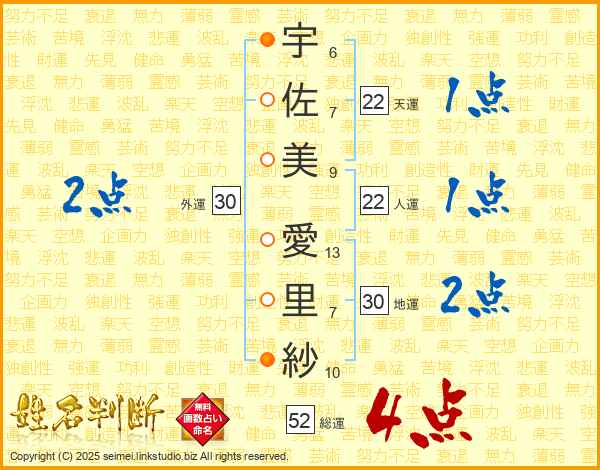 宇(6画)佐(7画)美(9画) 愛(13画)里(7画)紗(10画)