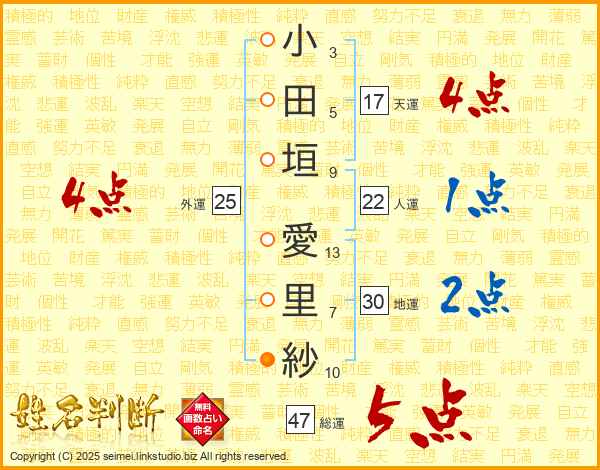 小(3画)田(5画)垣(9画) 愛(13画)里(7画)紗(10画)