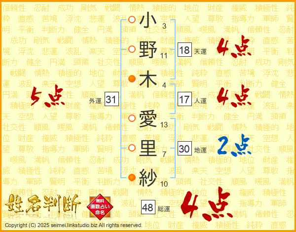 小(3画)野(11画)木(4画) 愛(13画)里(7画)紗(10画)