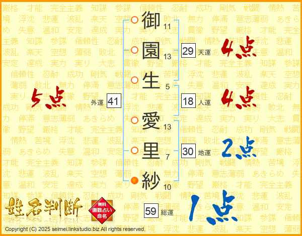 御(11画)園(13画)生(5画) 愛(13画)里(7画)紗(10画)