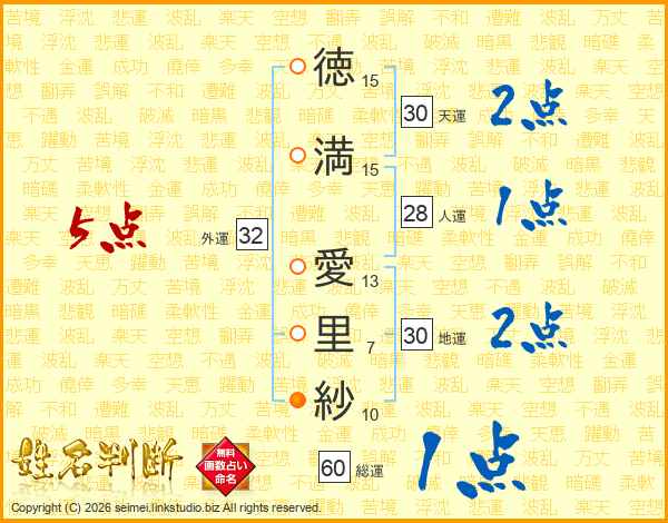 徳(15画)満(15画) 愛(13画)里(7画)紗(10画)
