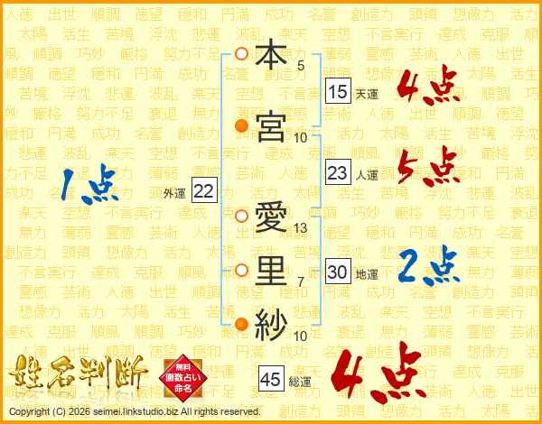 本(5画)宮(10画) 愛(13画)里(7画)紗(10画)