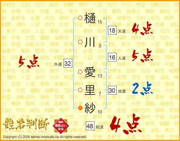樋(15画)川(3画) 愛(13画)里(7画)紗(10画)