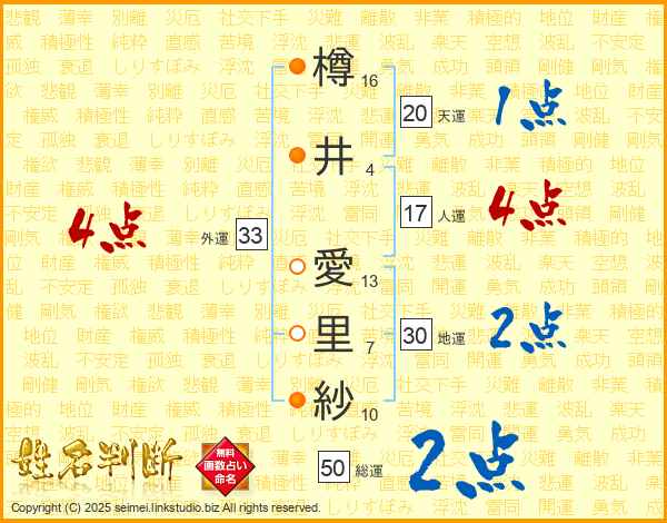樽(16画)井(4画) 愛(13画)里(7画)紗(10画)