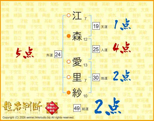 江(7画)森(12画) 愛(13画)里(7画)紗(10画)