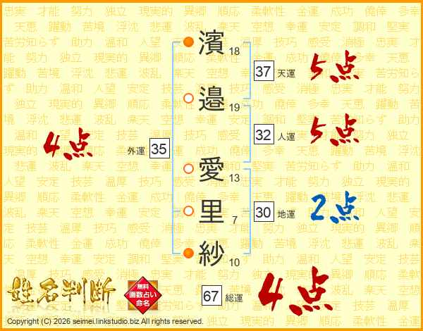 濱(18画)邉(19画) 愛(13画)里(7画)紗(10画)
