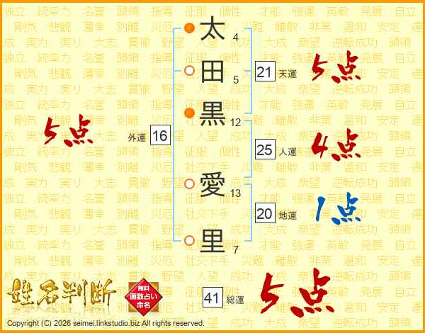 太(4画)田(5画)黒(12画) 愛(13画)里(7画)
