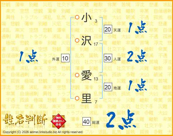 生活面を象徴する運勢です。外部から受ける影響力を表し、結婚運、家庭運や職場、環境への順応性を表します。総運から人運を引いた画数。姓や名が1文字の場合を除く。