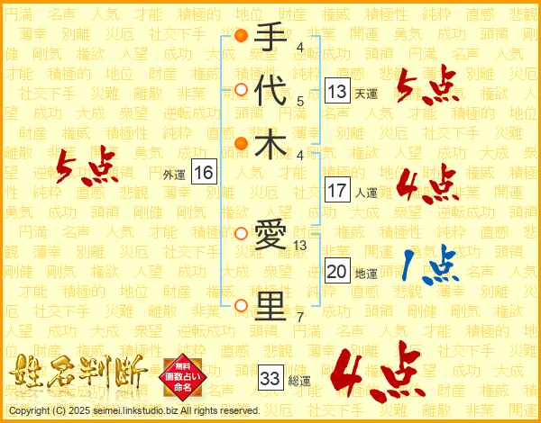 手(4画)代(5画)木(4画) 愛(13画)里(7画)