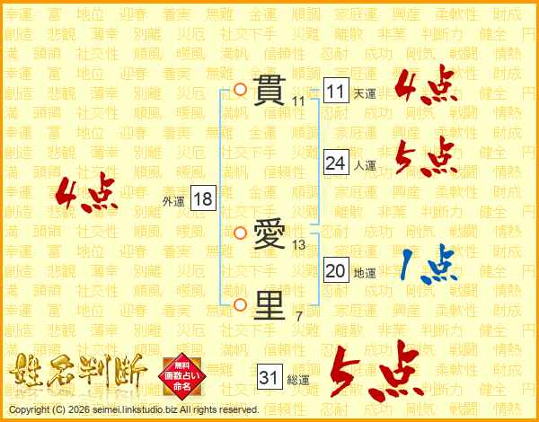 貫愛里さんの総運は31画の5点!