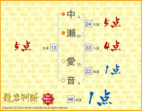 中(4画)瀬(20画) 愛(13画)音(9画)
