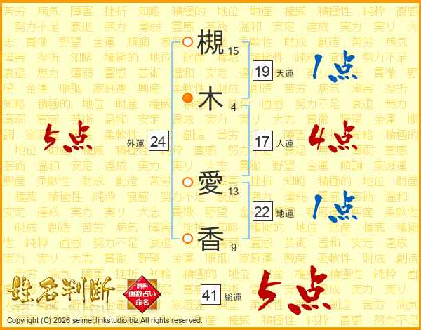 生活面を象徴する運勢です。外部から受ける影響力を表し、結婚運、家庭運や職場、環境への順応性を表します。総運から人運を引いた画数。姓や名が1文字の場合を除く。