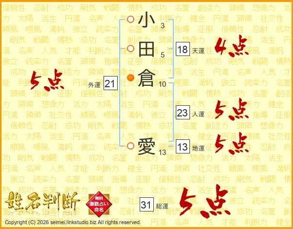 小田倉愛さんの総運は31画の5点!