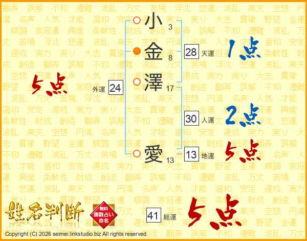 生活面を象徴する運勢です。外部から受ける影響力を表し、結婚運、家庭運や職場、環境への順応性を表します。総運から人運を引いた画数。姓や名が1文字の場合を除く。
