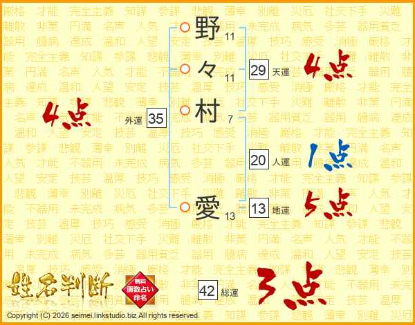 生活面を象徴する運勢です。外部から受ける影響力を表し、結婚運、家庭運や職場、環境への順応性を表します。総運から人運を引いた画数。姓や名が1文字の場合を除く。