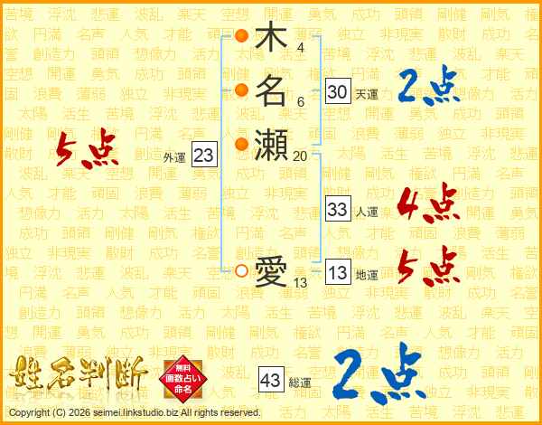 木(4画)名(6画)瀬(20画) 愛(13画)