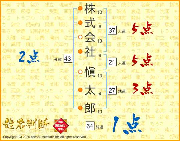 株(10画)式(6画)会(13画)社(8画) 愼(13画)太(4画)郎(10画)