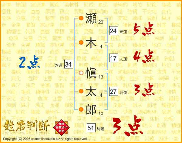 瀬(20画)木(4画) 愼(13画)太(4画)郎(10画)