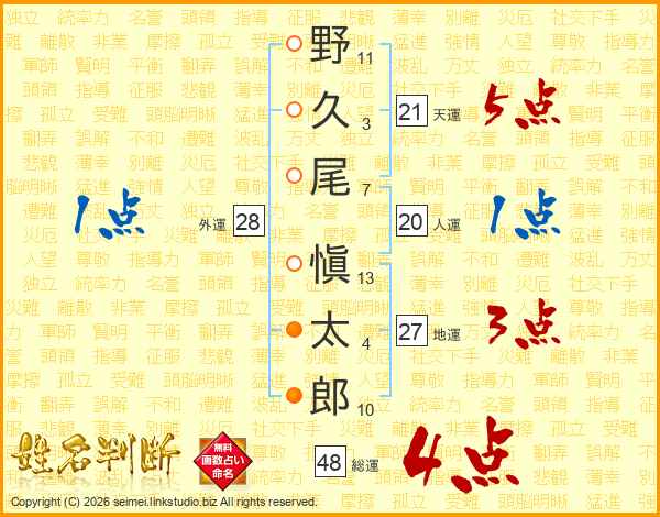 野(11画)久(3画)尾(7画) 愼(13画)太(4画)郎(10画)