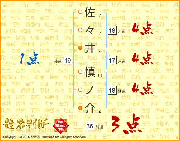 佐(7画)々(7画)井(4画) 慎(13画)ノ(1画)介(4画)