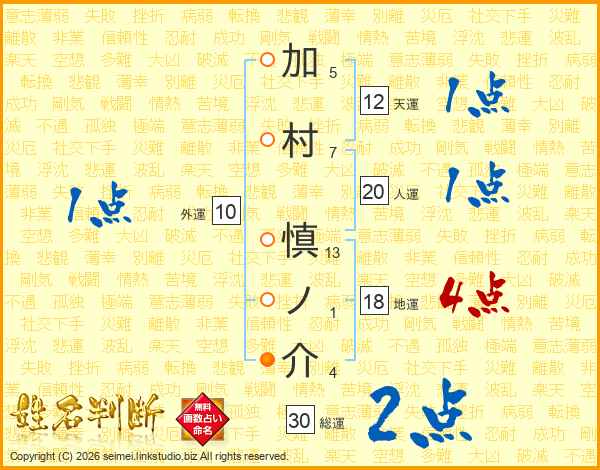 加(5画)村(7画) 慎(13画)ノ(1画)介(4画)