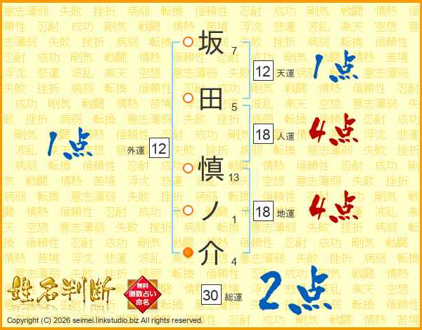 坂(7画)田(5画) 慎(13画)ノ(1画)介(4画)