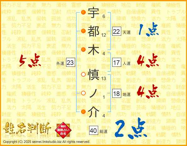 宇(6画)都(12画)木(4画) 慎(13画)ノ(1画)介(4画)