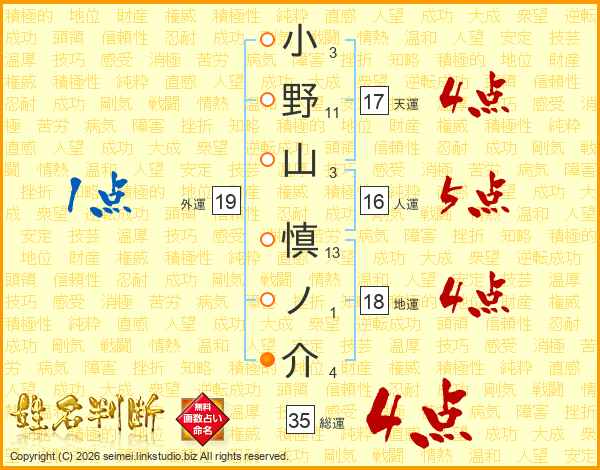 小(3画)野(11画)山(3画) 慎(13画)ノ(1画)介(4画)