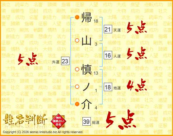 帰(18画)山(3画) 慎(13画)ノ(1画)介(4画)