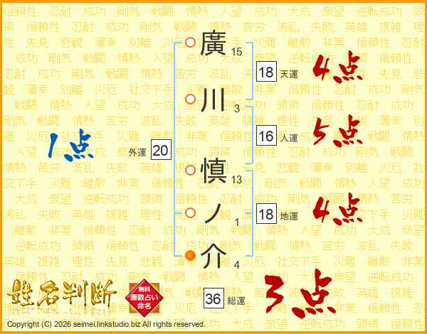 廣(15画)川(3画) 慎(13画)ノ(1画)介(4画)