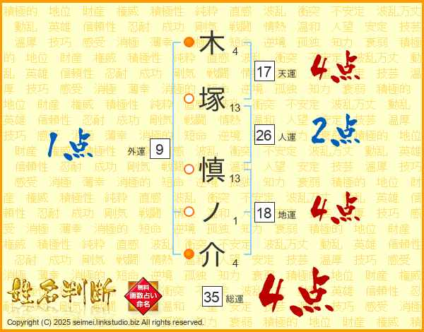 木(4画)塚(13画) 慎(13画)ノ(1画)介(4画)