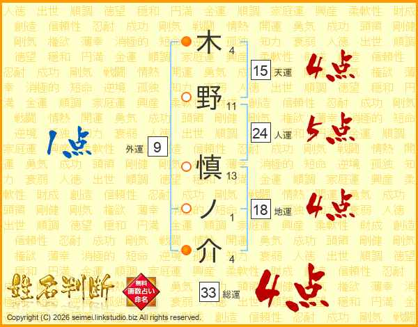 木(4画)野(11画) 慎(13画)ノ(1画)介(4画)