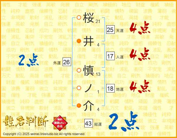 桜(21画)井(4画) 慎(13画)ノ(1画)介(4画)