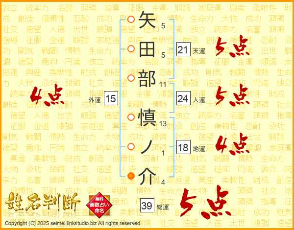 矢(5画)田(5画)部(11画) 慎(13画)ノ(1画)介(4画)