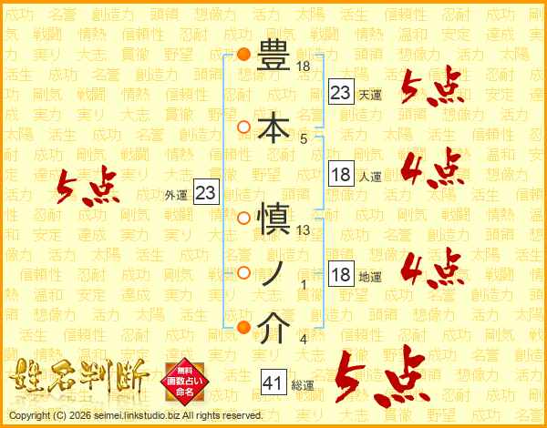 豊(18画)本(5画) 慎(13画)ノ(1画)介(4画)