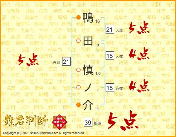 鴨(16画)田(5画) 慎(13画)ノ(1画)介(4画)