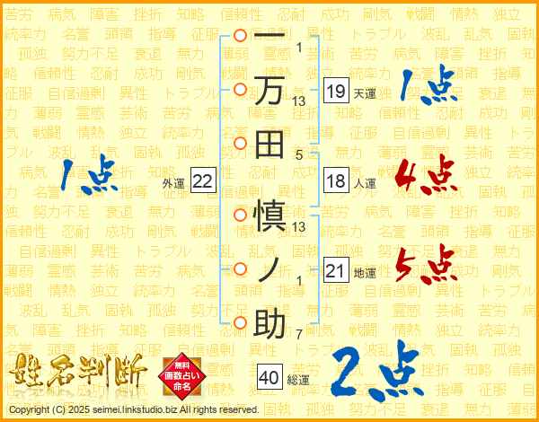 一(1画)万(13画)田(5画) 慎(13画)ノ(1画)助(7画)