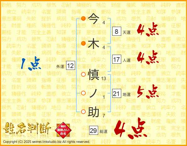 今(4画)木(4画) 慎(13画)ノ(1画)助(7画)