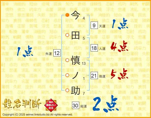 今(4画)田(5画) 慎(13画)ノ(1画)助(7画)