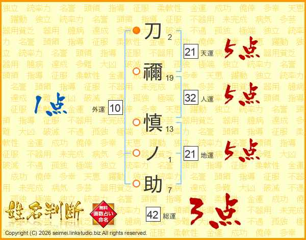 刀禰慎ノ助さんの地運は21画の5点!