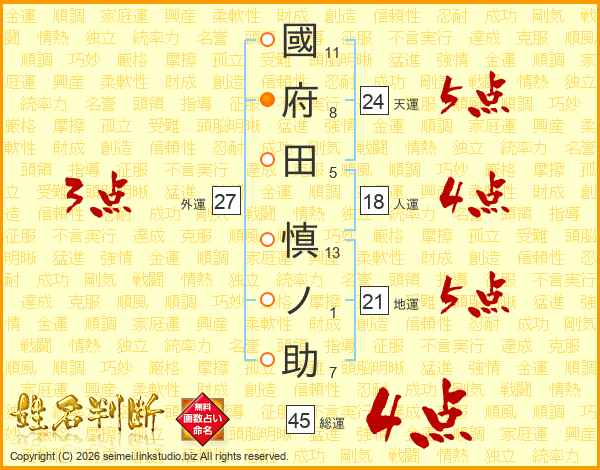 國(11画)府(8画)田(5画) 慎(13画)ノ(1画)助(7画)