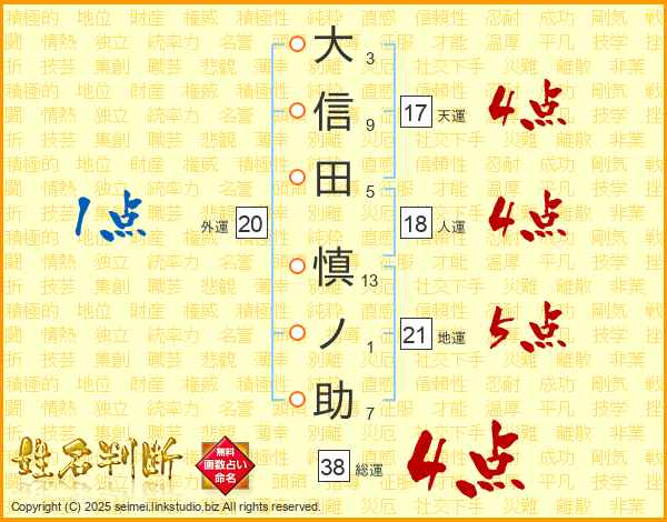 大(3画)信(9画)田(5画) 慎(13画)ノ(1画)助(7画)
