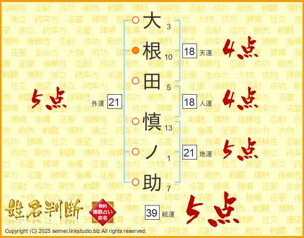 大(3画)根(10画)田(5画) 慎(13画)ノ(1画)助(7画)
